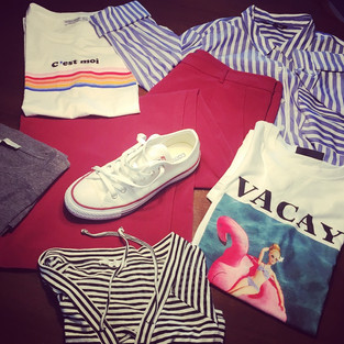 Oben sehen wir 8 Oberteile und 2 Paar Hosen. Dies ist eine grosse Outfit Capsule, bei welcher alles untereinander austauschbar ist. Die weissen Converse passen zu jeder Kombination perfekt dazu.